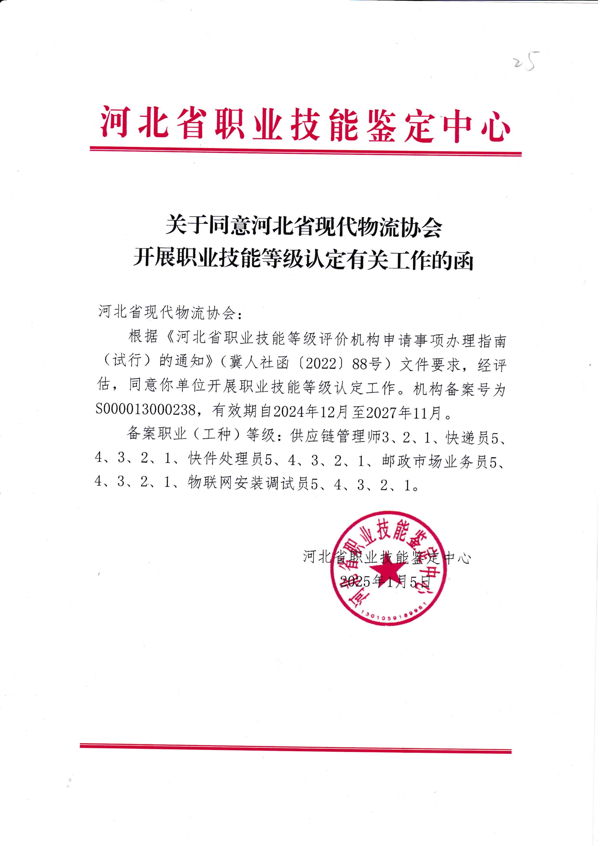 关于同意河北省现代物流协会开展职业技能等级认定工作的函